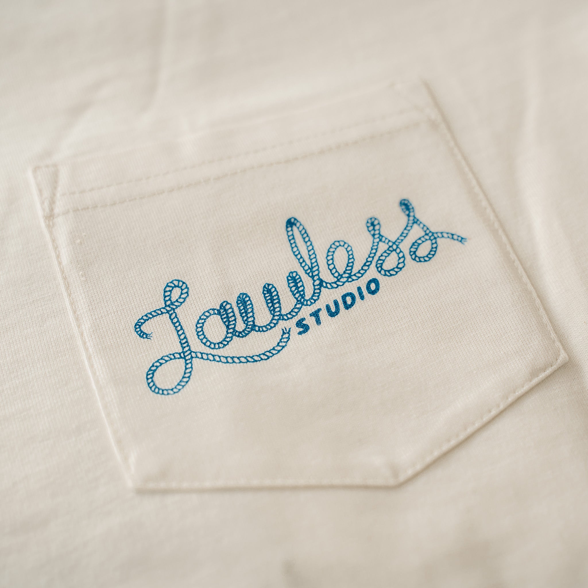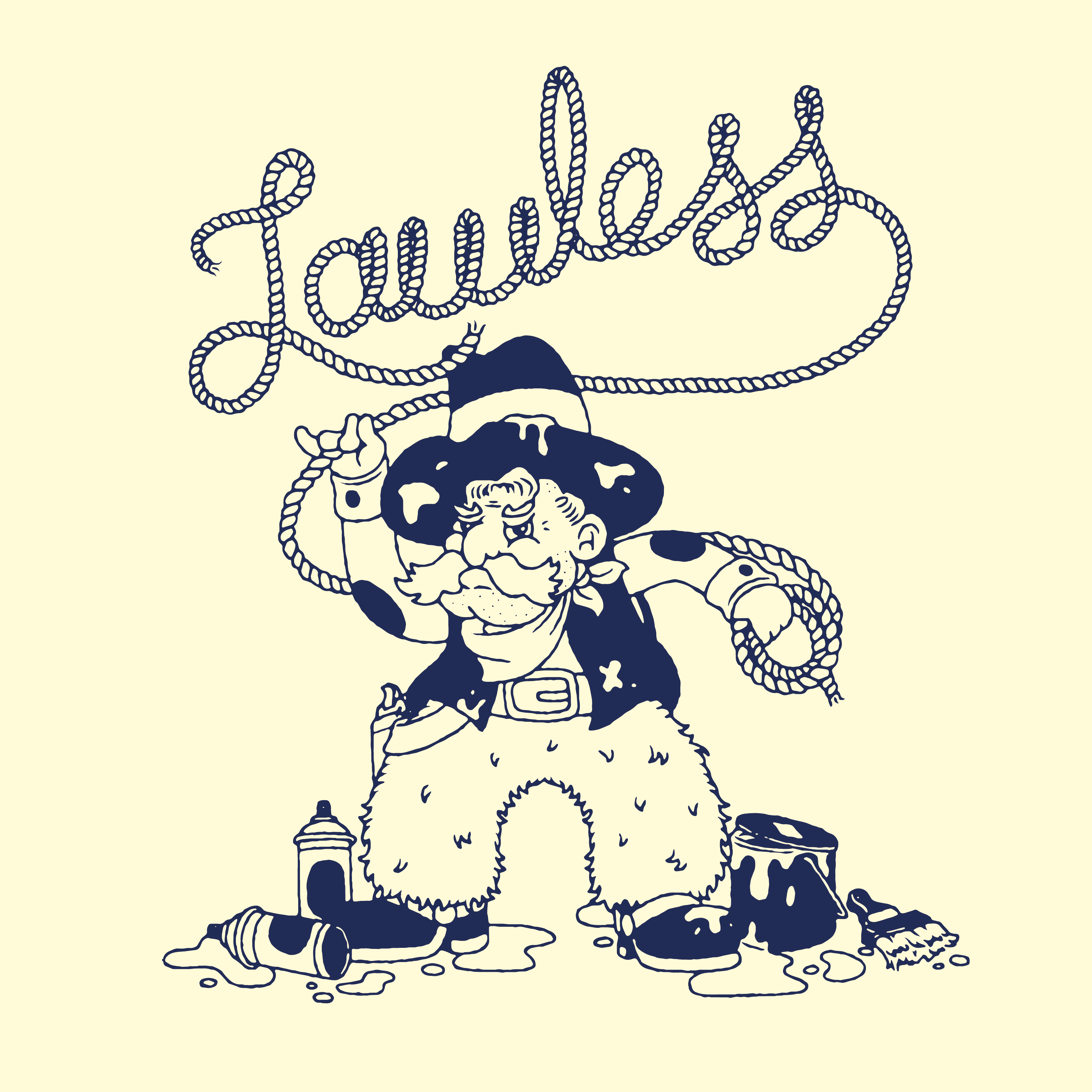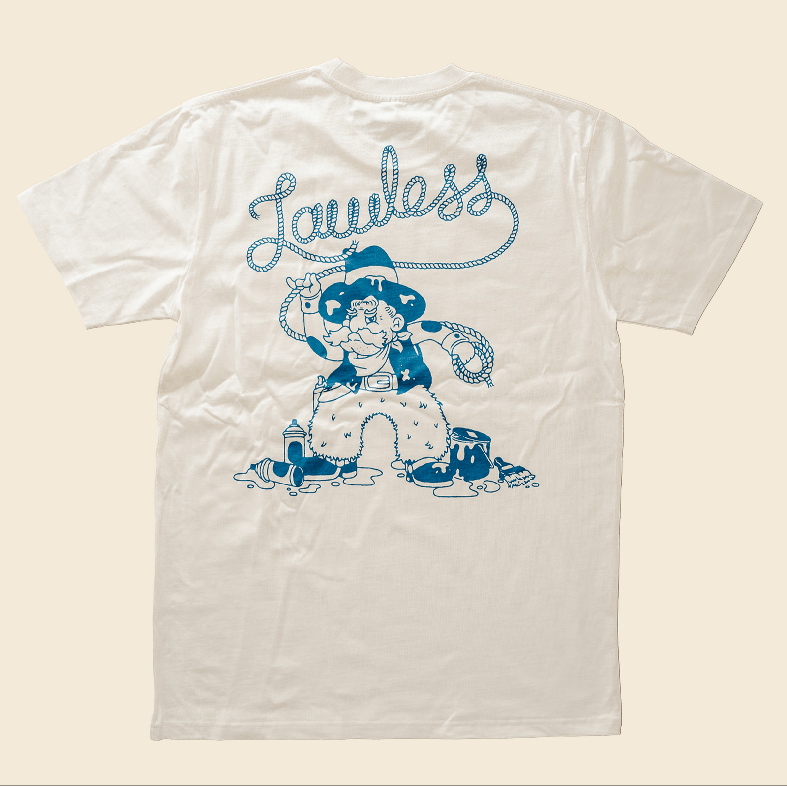 Designed by the peerless Illwookie. A Lawless bandit, slinging cans around for fun. Pocket on the front bearing the Lawless Studio logo in some sort of yarny rope type vibe. Pop some pens in it.